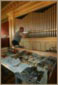 Vier Orgelbauer, vier Bereiche. Markus Graser ist zuständig für Taschen und Windladen, seine Frau Renate kümmert sich mit Sven Manietta um das Pfeifenwerk, Ulrich Büttners Bereich ist Spieltisch und Traktur. Auf los geht’s los. Nach einer radikalen Reinigung durch die komplette Mannschaft, (man bedenke, drei kräftige Staubsauger und ein lauter Kompressor dürften die Nerven der unmittelbar neben uns Studierenden ziemlich beansprucht haben) befasst sich jeder mit seinen Aufgaben. Während das Pfeifenwerk gereinigt und saniert wurde beginnt der Aufbau des