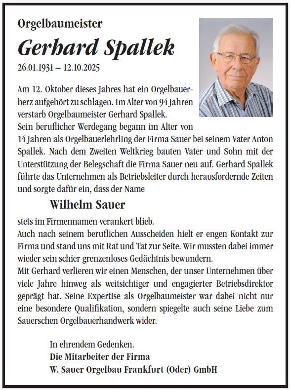Orgelbaumeister Gerhard Spallek – Nachruf